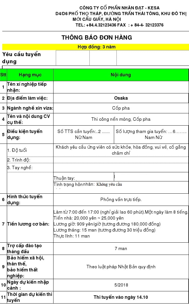 - Địa điểm làm việc: Tỉnh Osaka