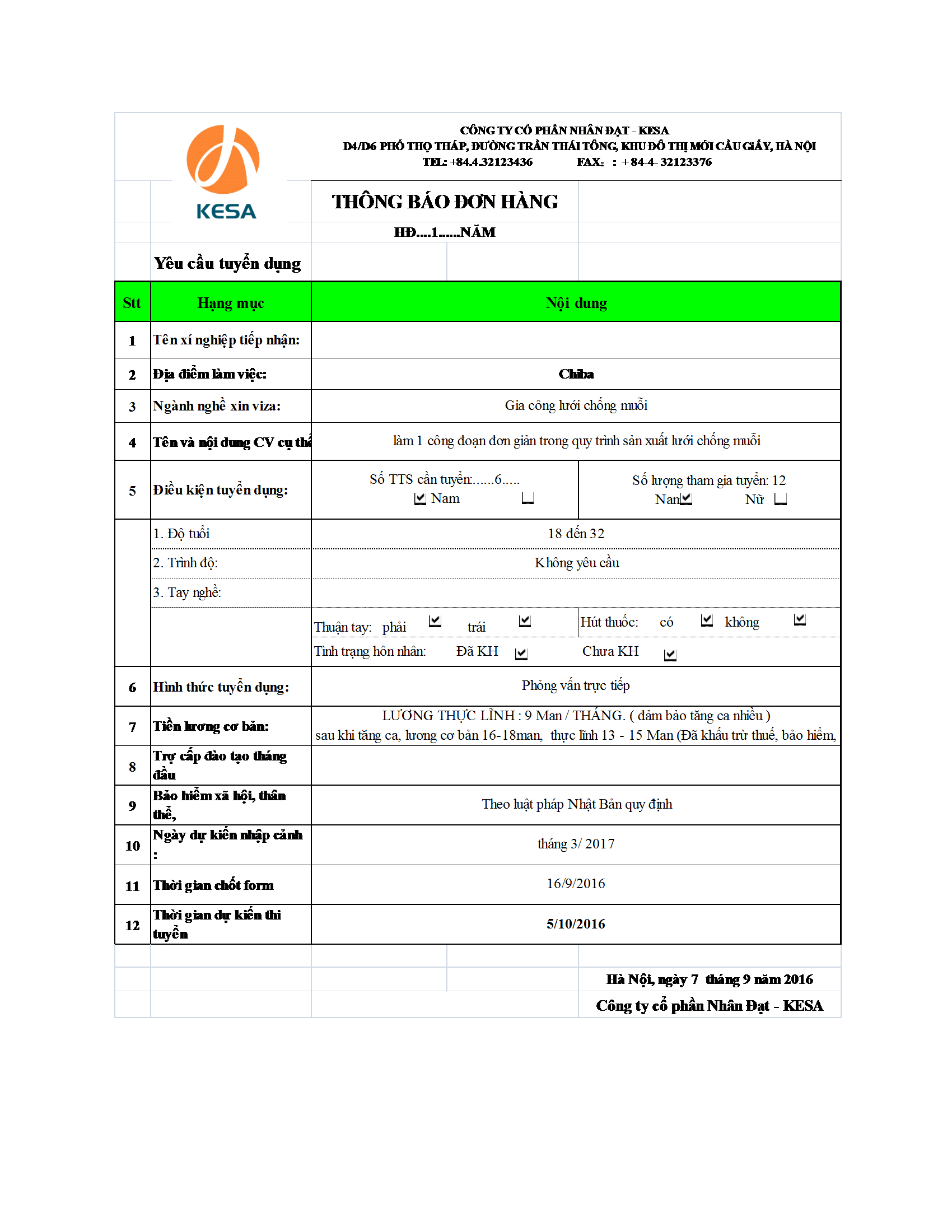 - Địa điểm làm việc: Tỉnh Chiba