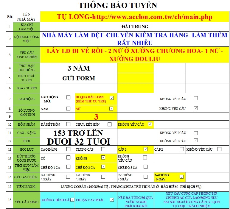 - Giới tính:3 NỮ: > 153cm , dưới 32 tuổi