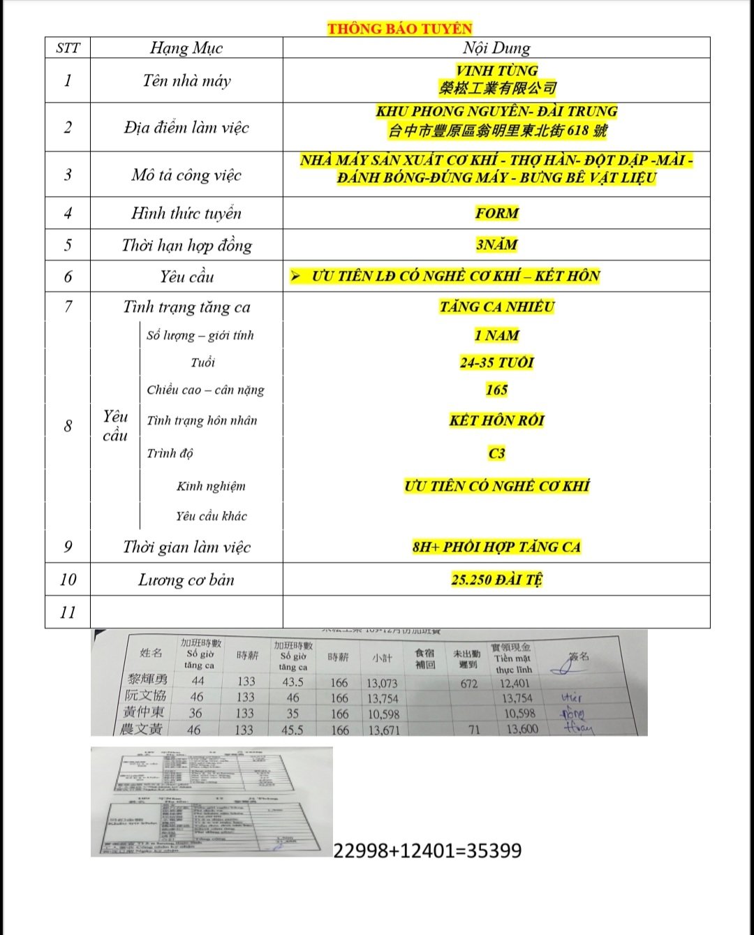 - Giới tính: Nam. Ưu tiên LĐ có tay nghề cơ khí + kết hôn