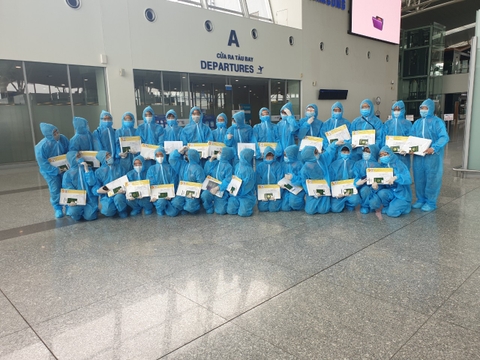 Đoàn Quần Sáng xuất cảnh ngày 13.08.2020 nghiêm túc mặc quần áo phòng dịch trước khi lên máy bay( nguồn:Công ty Nhân Đạt KESA)