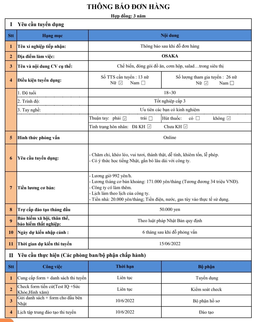 - Địa điểm làm việc: Tỉnh Osaka
