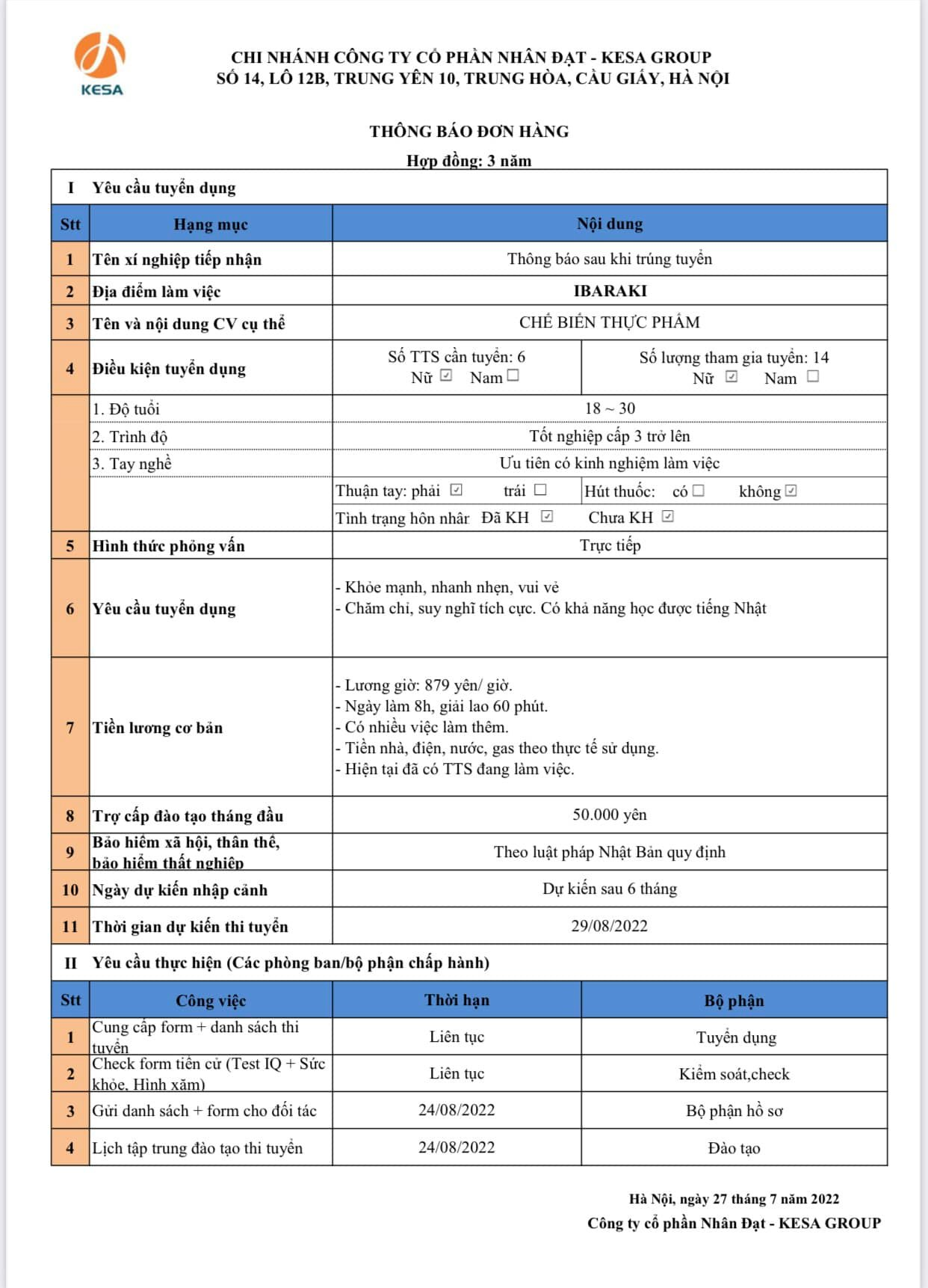 TUYỂN 6 NỮ - CHẾ BIẾN THỰC PHẨM - IBARAKI