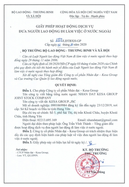 Công ty CP Nhân Đạt - KESA Group, đã được Bộ lao động thương binh và xã hội cấp giấy phép hoạt động dịch vụ đưa người lao động đi làm việc ở nước ngoài theo công văn số 1222/LĐTBXH-GP.Cấp ngày 01 tháng 10 năm 2020.